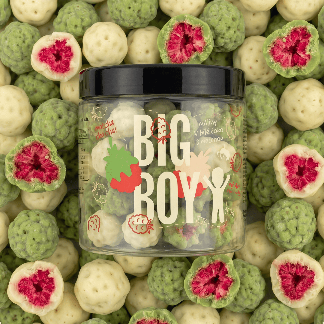 Lyofilizované maliny v bílé čokoládě a matcha čaji. Sladká kombinace, která patří mezi současné chuťové trendy. Křupavé lyofilizované maliny (17 %) jsou obalené do sametové bílé čokolády a část z nich je navíc doplněna o prémiovou matchu z Japonska (2,5 %). V balení tak najdete mix klasické bílé čokolády a moderní matcha varianty. Ovocná svěžest malin, krémová sladkost čokolády a jemně zelený nádech matchy vytváří stylovou kombinaci, které se jen těžko odolává.