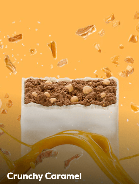 Crunchy Caramel: Zvlhčující látky (maltity, glycerin), bílá poleva [plně ztužené rostlinné tuky (kokos, brukev řepka), cukr, sušené odstředěné mléko, laktóza, sušené plnotučné mléko, emulgátor (lecitiny), aroma] 18%, syrovátkový proteinový koncentrát, koncentrát mléčných bílkovin, fruktooligosacharidy, křupavé kousky karamelu [glukózový sirup, cukr, kypřící látky (uhličitan sodný)] 7,2%, extrudovaná sója 7,2%, hydrolyzovaný kolagen, plně rafinovaný kokosový olej, pitná voda, instantní syrovátkový proteinový izolát {syrovátkový proteinový izolát, emulgátor [lecitiny (sója)]}, emulgátor [lecitiny (sója)], mandlová mouka, želírující látka (karagenan), aromata, potravinářská sůl, nízkotučný kakaový prášek, konzervant (sorban draselný), stabilizátor (chlorid draselný), antioxidant (alfa-tokoferol), sladidlo (sukralóza).