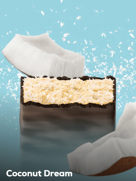 Coconut Dream: Zvlhčující látky (maltity, glycerin), kakaová poleva [sladidlo (maltity), plně ztužené rostlinné tuky (kokos, brukev řepka), nízkotučný kakaový prášek, emulgátor (lecitiny)] 15%, kokosové hobliny 15%, syrovátkový proteinový koncentrát, fruktooligosacharidy, mléčný proteinový koncentrát, hydrolyzovaný kolagen, plně rafinovaný kokosový olej, instantní syrovátkový proteinový izolát {syrovátkový proteinový izolát, emulgátor [lecitiny (sója)]}, pitná voda,mandlová mouka, emulgátor [lecitiny (sója)], želírující látka (karagenan), aromata, konzervant (sorban draselný), stabilizátor (chlorid draselný), antioxidant (alfa-tokoferol), sladidlo (sukralóza).