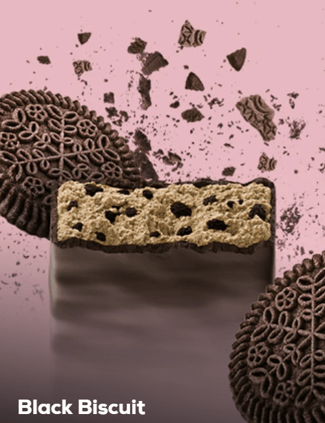 Black Biscuit: Zvlhčující látky (maltity, glycerin), kakaová poleva [sladidlo (maltity), plně ztužené rostlinné tuky (kokos, brukev řepka), nízkotučný kakaový prášek, emulgátor (lecitiny)] 15%, kousky sušenek [rýžová mouka, cukr, kukuřičný škrob, rafinovaný kokosový olej, nízkotučný kakaový prášek, glukózový sirup, potravinářská sůl, zahušťovadlo (guma guar), kypřicí látky (hydrogenuhličitan amonný, hydrogenuhličitan sodný), aroma] 10%, syrovátkový proteinový koncentrát, mléčný proteinový koncentrát, fruktooligosacharidy, hydrolyzovaný kolagen, plně rafinovaný kokosový olej, instantní syrovátkový proteinový izolát {syrovátkový proteinový izolát, emulgátor [lecitiny (sója)]}, pitná voda, mandlová mouka, emulgátor [lecitiny (sója)], aromata, želírující látka (karagenan), konzervant (sorban draselný), stabilizátor (chlorid draselný), antioxidant (alfa-tokoferol), sladidlo (sukralóza).