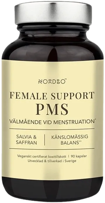Nordbo Female Support PMSJedná se o komplex pokročilých bioaktivních složek pro podporu žen během PMS a menstruace. Obsahuje extrakt šafránu, šalvěj a jetel, které pomáhají navodit pocit pohody a regulují fyzický diskomfort při menstruaci.