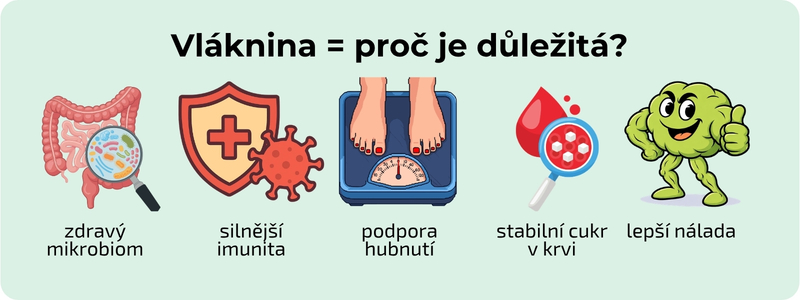 Kromě trávení má vláknina zásadní vliv i na střevní mikrobiom. Slouží jako potrava pro prospěšné bakterie, které produkují látky podporující imunitu, metabolismus i celkovou kondici organismu. Bez dostatečného příjmu vlákniny nemůže mikrobiom fungovat optimálně, což se může projevit nejen na trávení, ale i na celkovém zdraví.¨