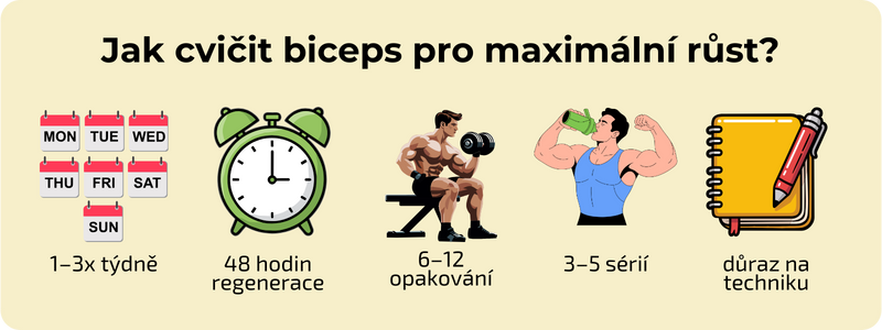 Frekvence tréninku: biceps je vhodné trénovat 1–3× týdně podle celkového objemu tréninku a regenerace. Pamatujte, že se biceps výrazně zapojuje i při tréninku zad.