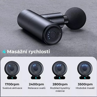 Masážní pistole je vybavena 4 úrovněmi intenzity. Každá rychlost má jiný účel a úrovně rychlostí se používají podle toho, čeho chcete dosáhnout, ať už se jedná o aktivaci svalů nebo o profesionální masáž. Ovládání rychlosti zajišťuje jedno jediné tlačítko.