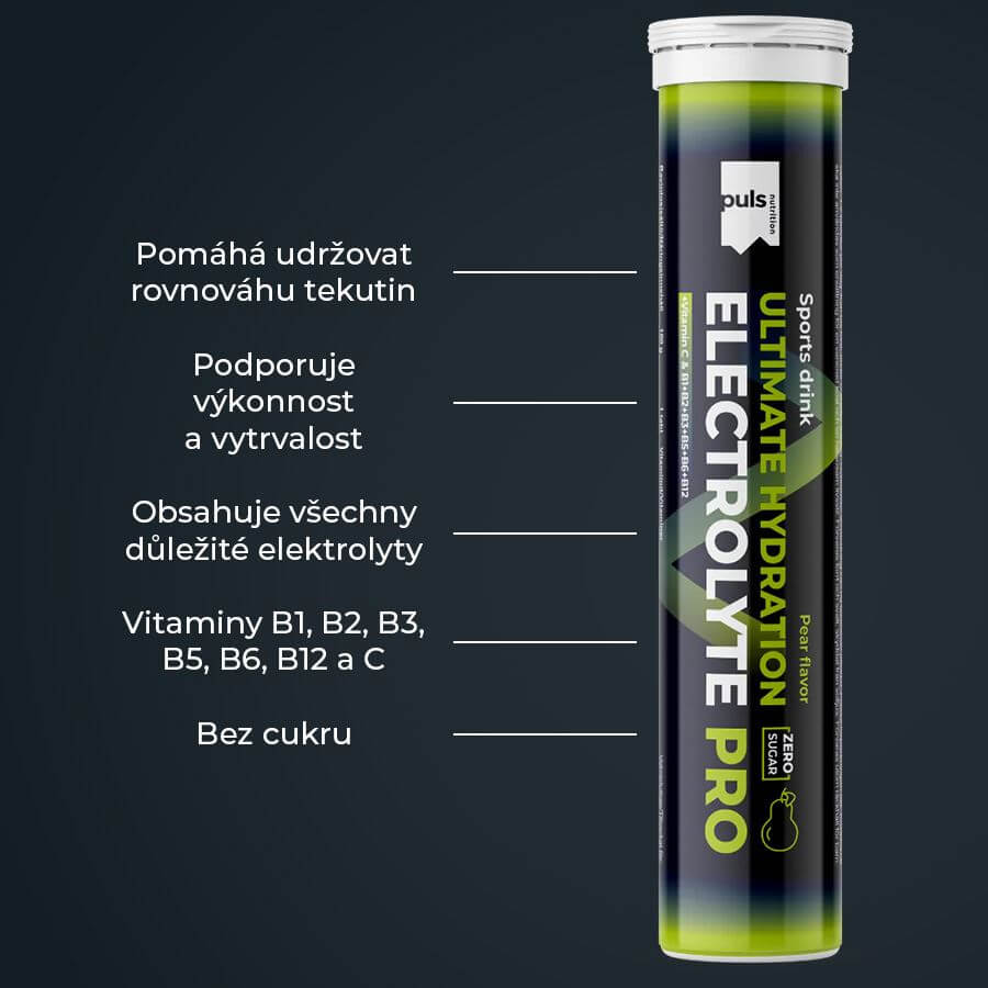 Puls Electrolyte Pro obsahuje klíčové elektrolyty – hořčík, sodík, draslík, vápník a chloridy, které jsou důležité pro správnou hydrataci organismu. Pomáhají udržovat rovnováhu tekutin v těle a jsou důležité zejména při sportu, fyzické zátěži nebo zvýšeném pocení.