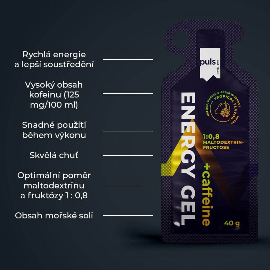 Puls Energy + Caffeine Gel obsahuje kombinaci maltodextrinu a fruktózy, která poskytuje rychle dostupnou energii během fyzické aktivity. Optimalizovaný poměr 1:0,8 pomáhá efektivně doplňovat sacharidy a podporovat výkon při vytrvalostních sportech.