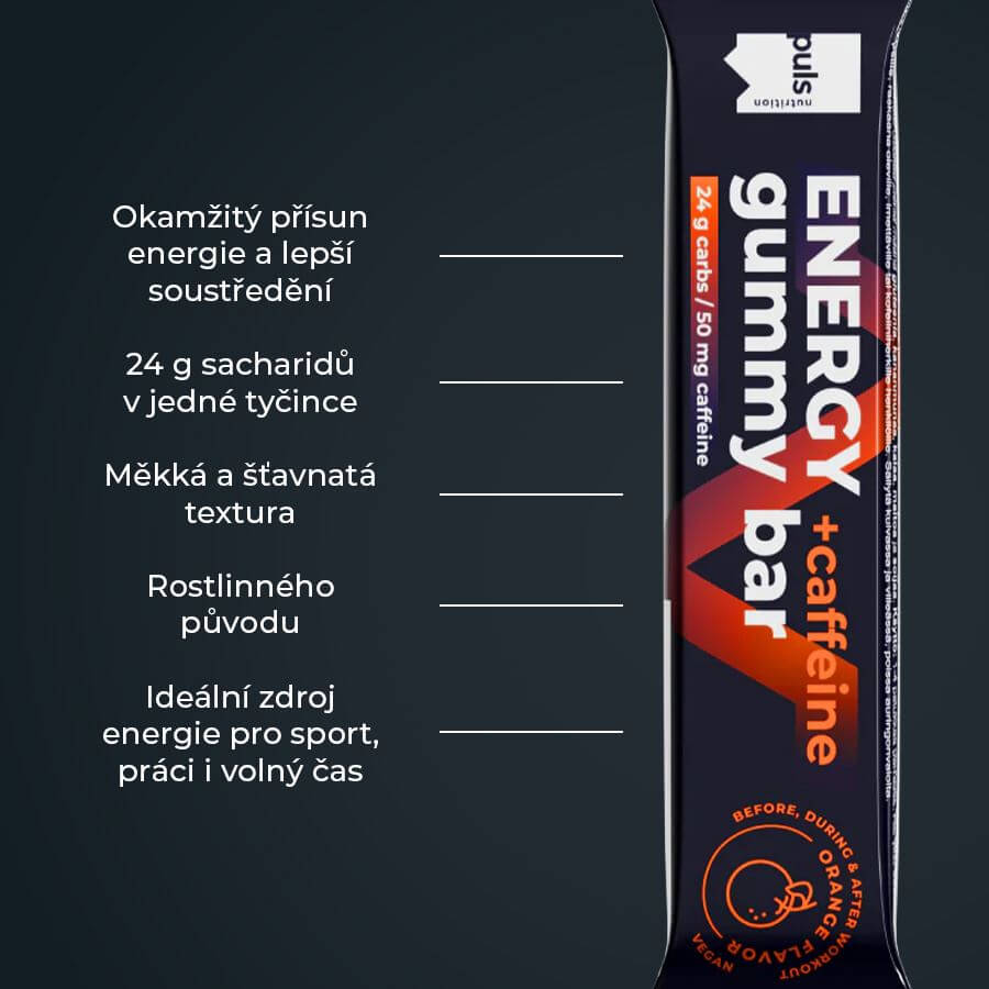 Okamžitá energie, lepší soustředění a praktická forma pro výkon i každodenní aktivitu. Puls Energy Gummy Bar je želé energetická tyčinka navržená pro rychlé doplnění energie během sportu i náročného dne. Každá tyčinka poskytuje rychle vstřebatelné sacharidy, které pomáhají dodat tělu energii přesně ve chvíli, kdy ji potřebujete. Varianta s pomerančovou příchutí navíc obsahuje 50 mg kofeinu, který podporuje bdělost, soustředění a vytrvalostní výkon.