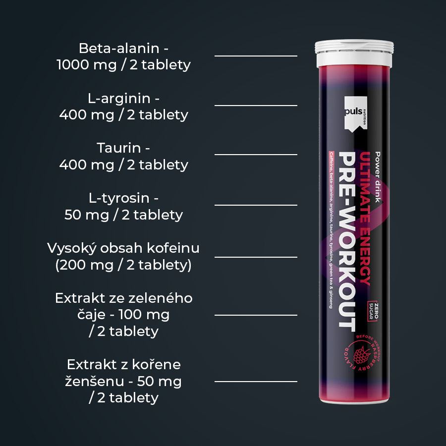Když potřebujete víc energie, větší soustředění a chuť jít za hranici běžného výkonu. Pre-workout ultimate energy od Puls Nutrition je praktický tréninkový booster ve formě šumivých tablet, který si připravíte během několika sekund. Silná kombinace aminokyselin, rostlinných extraktů a kofeinu je navržena pro podporu intenzivního tréninku – v posilovně i při jiných sportech.